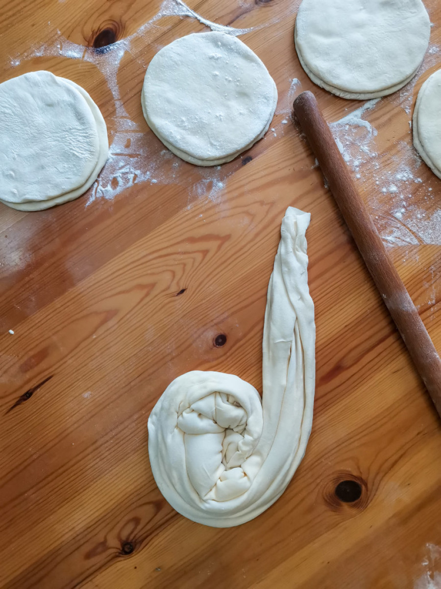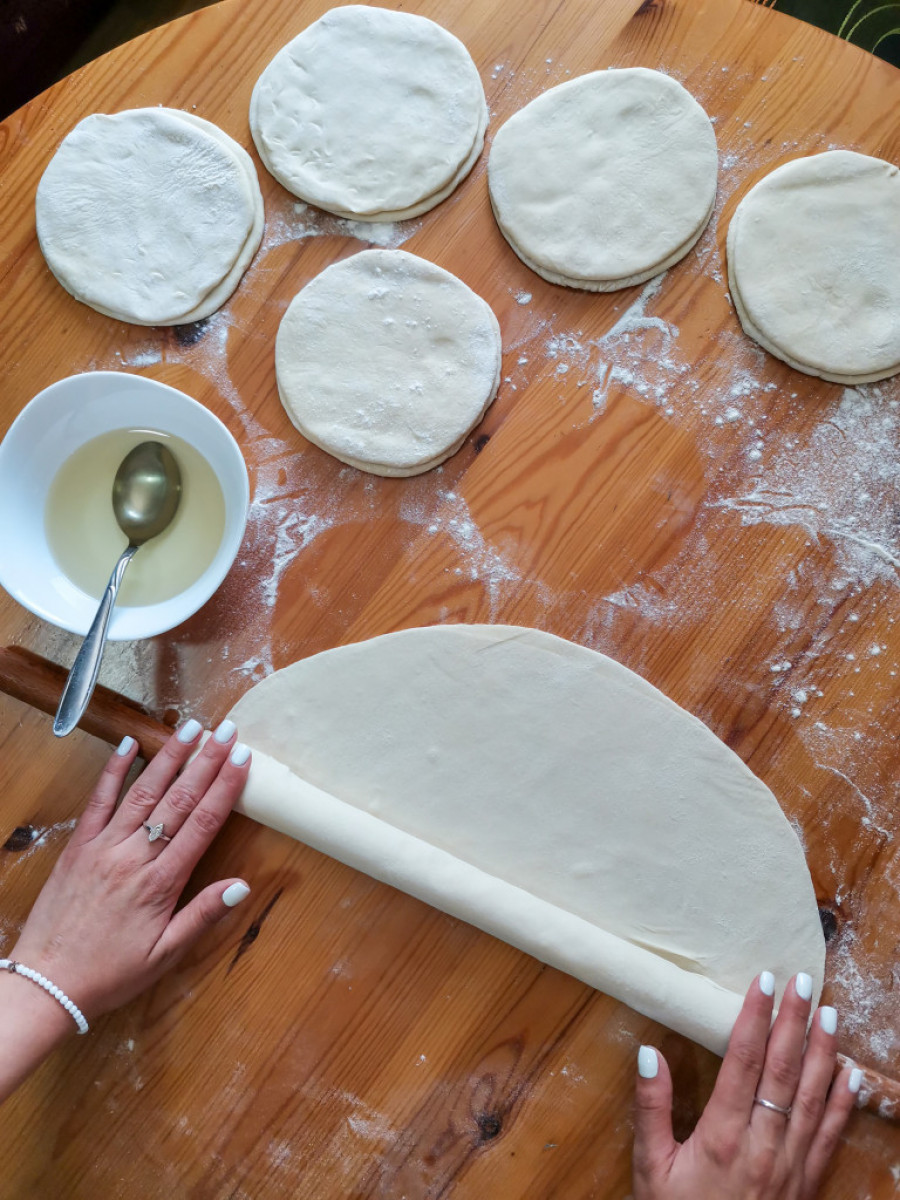 - Kada se spoje dva manja kruga od testa, potrebno je razvući veliku okruglu koru koja ima prečnik oko 60 centimetara.