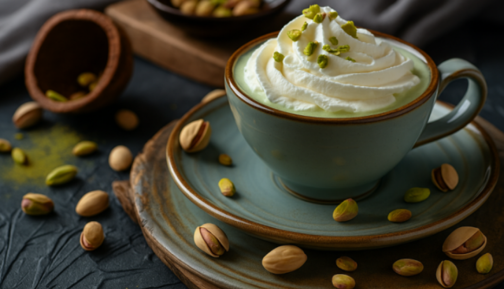 Dve kašičice krema od pistaća stavite u šolju, pa ih poravnajte po dnu. Dodajte vruć espreso. Polako sipajte mleko, pa pospite seckanim pistaćima. Na kraju kafu dekorišite sa malo šlaga.