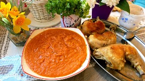 Vodom prelijte piletinu pa dodajte kašiku suvog biljnog začina i kuvajte, sve dok ne omekša. Onda ga izvadite i iskidajte na duge trakice. Sitno seckan crni luk propržite na zagrejanom ulju pa umešajte brašno i kratko propržite. Zatim pomerite tiganj sa šporeta pa dodajte seckano meso. Vratite na vatru i polako nalijte supu u kojoj se