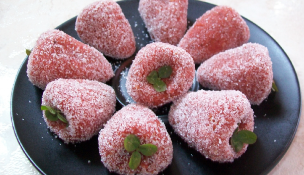 Mleko skuvajte, pa dodajte orahe, keks, šećer, vanilin šećer i rum. Promešajte dobro da dobijete čvrstu smesu. U 50 ml vode rastvorite crvenu boju i ekstrakt jagode. Otopite zelenu boju u preostaloj vodi.Oblikujte jagode, pa ih umačite u smesu.Zatim ih valjajte u šećer, pa stavite da se suše. Umačite listiće badema u zelenu boju, pa stavljajte na vrh.
