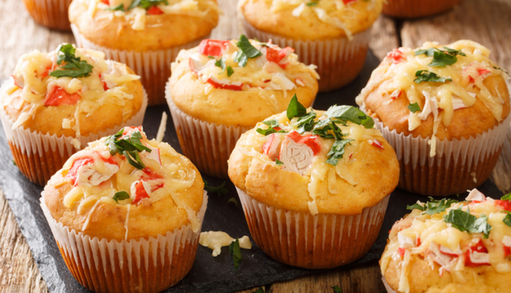 Rernu zagrejte na 180 stepeni. U jednoj posudi umutite jaja sa jogurtom i uljem. Dodajte brašna i prašak za pecivo, pa promešajte. Onda dodajte rendani sir i iseckane surimi štapiće. Posolite i promešajte da dobijete ujednačenu smesu. Izlijte smesu u korpice za mafine. Po vrhu dodajte malo rendanog sira i sveže seckano bilje. Pecite projice oko 25 minuta, u rerni zagrejanoj na 180 stepeni.