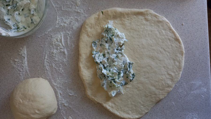 Kvasac potopite u mlakoj vodi sa šećerom i kašičicom brašna. Ostavite da se aktivira. Pomešajte jogurt, toplo mleko i ulje. Dodajte aktivirani kvasac. U brašno dodajte so i postepeno dodajte u smesu od mleka. Mesite dok ne dobijete meko testo. Ostavite da raste pola sata. Za fil, zelje blanširajte, dobro ocedite i iseckajte. Sjedinite sa krem sirom i pavlakom. Testo podelite na pet loptica. Svaku razvucite u krug veličine malog tanjira. Na sredinu druge polovine kruga stavite kašiku fila i preklopite. Po ivicama kruga pritisnite viljuškom kako bi se testo zalepilo. Pržite na malo zagrejanog ulja u teflonskom tiganju na srednjoj vatri. Poređajte pitice (koliko stane), poklopite i kad porumene okrenite na drugu stranu da dobiju smeđu boju.