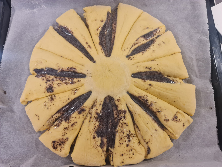 Testo: Pomešajte kvasac i toplo mleko, dodajte so i kašiku šećera i ostavite da se kvasac aktivira. Dodajte jaja, puter, jogurt, narendanu koru limuna i ostatak šećera. Sjedinite i zamesite testo postepeno dodajući brašno. Pokrijte folijom i krpom, ostavite da naraste. Podelite na četiri dela, napravite loptice i ostavite 15 minuta da rastu. Svaku rastanjite oklagijom i premažite filom, osim poslednje. Radite to u plehu. Čašom na sredini testa obeležite krug, a ostatak testa isecite na 16 jednakih trouglova. Motajte trouglove na unutra tako da spajate dva kraja trougla. Pokrijte pogaču i ostavite 10 minuta da odstoji. Premažite je umućenim žumancetom i pecite na 200 stepeni oko 20 minuta.